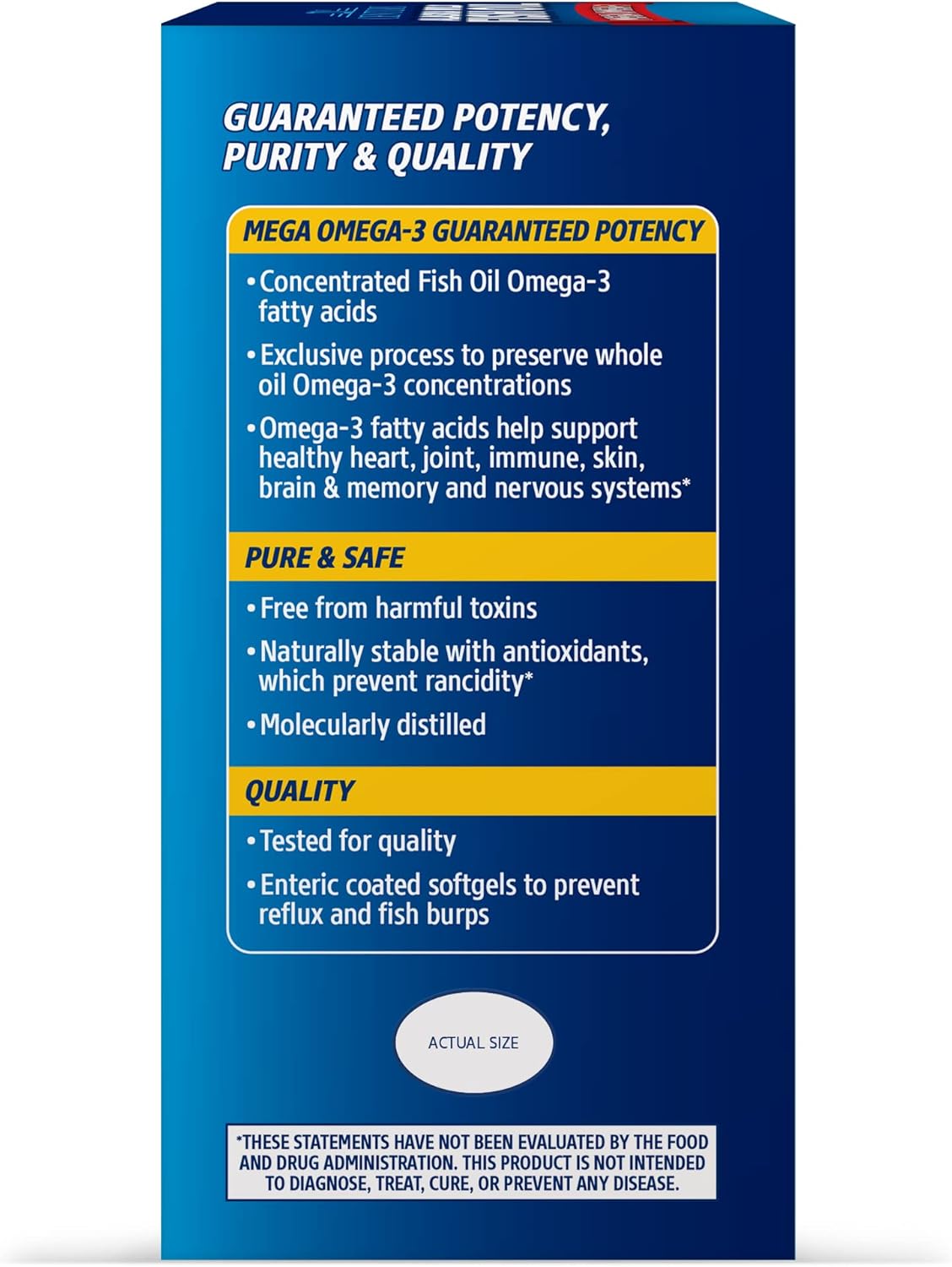 Richest concentration of Mega Omega-3 naturally obtainable from fish oil Exclusive process to preserve whole oil. Mega Omega-3 fatty acids helps maintain Healthy Heart, Joint, Immune, Skin, Brain and Memory and Nervous System Supportive but not conclusive research shows that consumption of EPA and DHA omega-3 fatty acids may reduce the risk of coronary heart disease (See supplement facts for fat and cholesterol content)Free from harmful toxins Naturally stable with antioxidants which prevent rancidityMolecularly distilled.From cold water deep sea fish Non-Farm Raised Enteric coated soft gels to prevent reflux and fish burps.Richest Levels of Naturally Occurring EPA & DHA.Helps maintain healthy levels of cholesterol already within normal limits.Free from fishy aftertaste found with other fish oil and EPA/DHA products This product contains soy and fish (herring, anchovy, mackerel, sardine, sprat, and salmon) ingredients.These statements have not been evaluated by the Food and Drug Administration. This product is not intended to diagnose, treat, cure or prevent any disease.