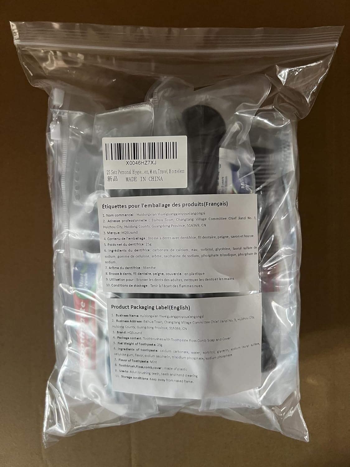 Comprehensive Hygiene Kits. 7-IN-1 HQSLsund travel toiletry kit is available in 25 sets that include 25 soap(14g/0.5oz), 25 toothbrushes(blue), 25 toothpastes(25g/0.88oz), 25 combs(black)and 125 floss picks. Suitable hygiene solution for hotels, homeless. Each kit is packaged in a reusable zipper bag.