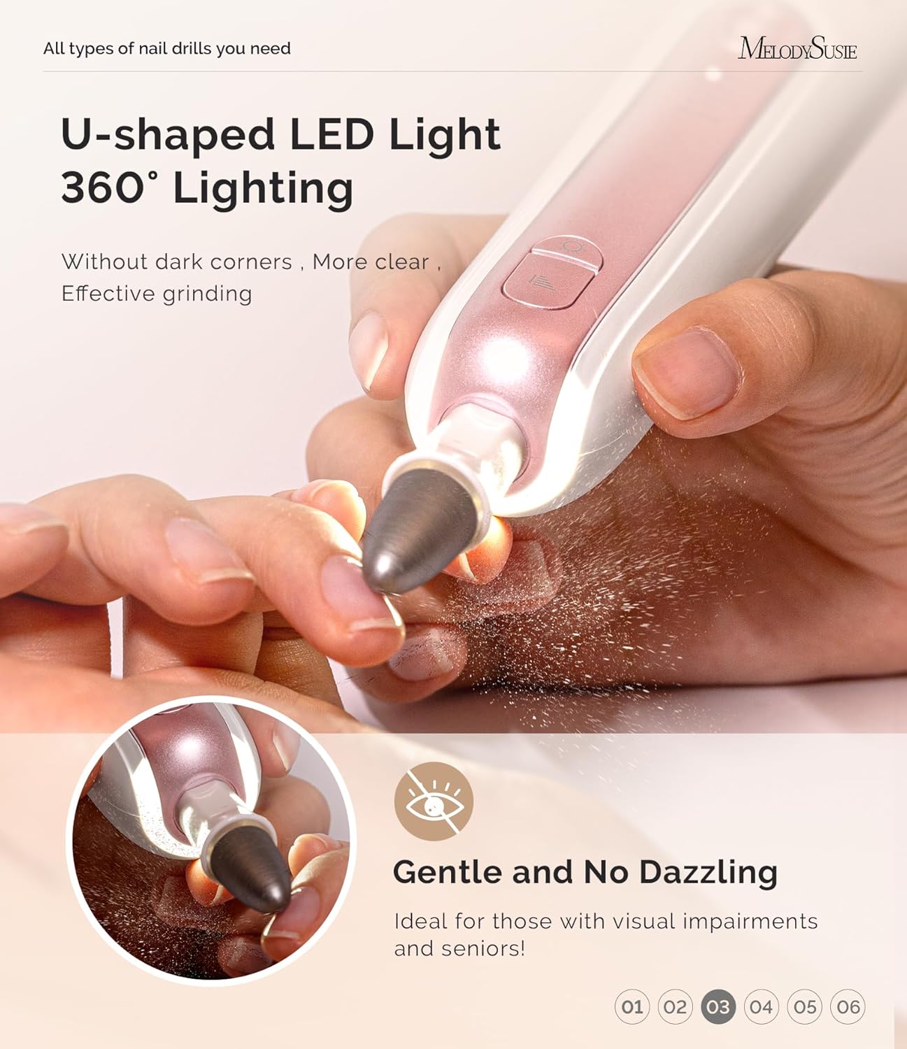 360° Illumination with Surround LED Light: Our electric nail file features a U-shaped surrounding LED light, providing 360° illumination without dead spots or glare. This thoughtful design ensures a clear view of your grinding area, enhancing efficiency for at-home or salon manicures and pedicures, especially in low-light situations, and is gentle on your eyes. It’s also ideal for those with visual impairments and seniors!