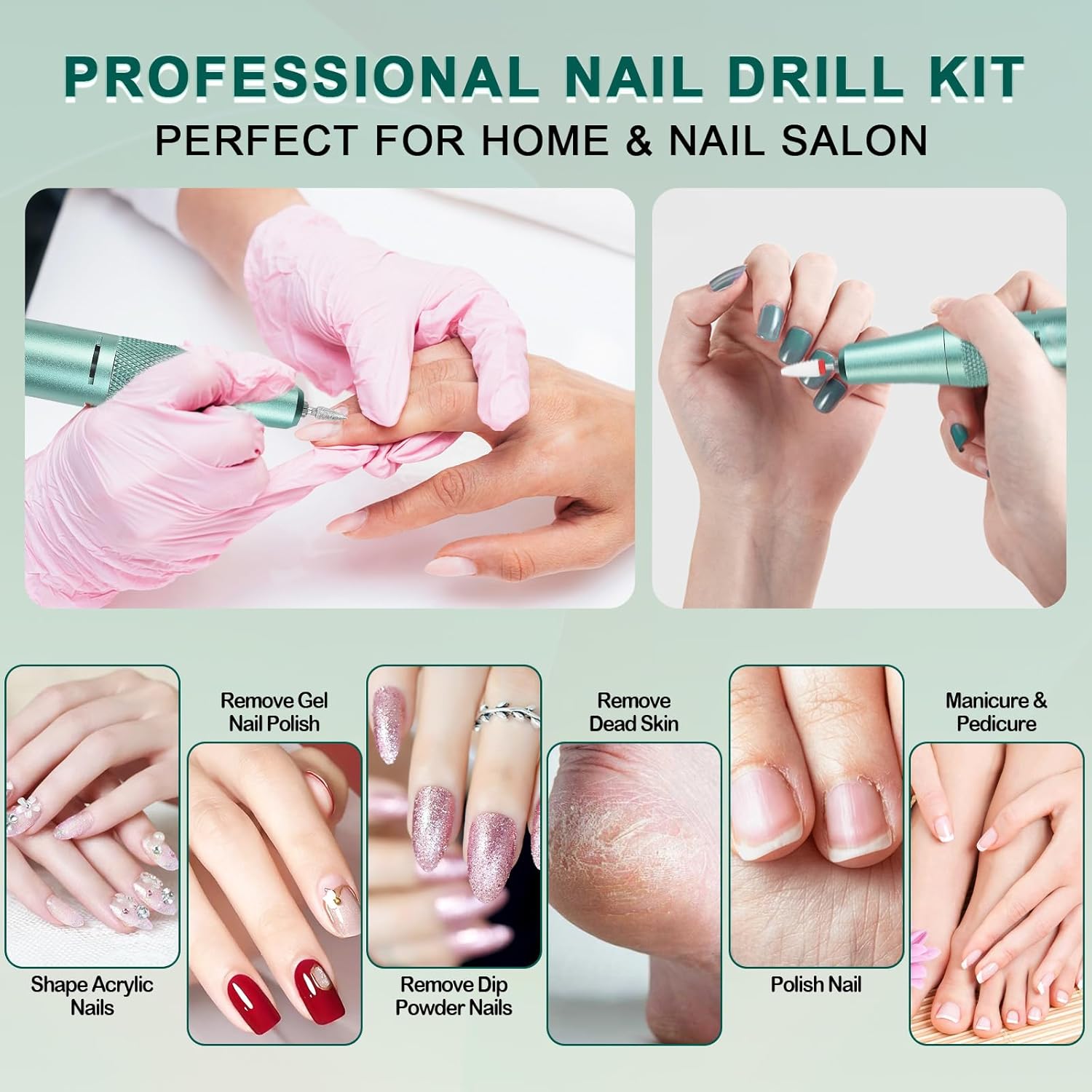 A Game-Changer for Home Manicures!This Electric Nail Drill Kit is a fantastic tool for both home enthusiasts and professional nail technicians. Itâs powerful, versatile, and incredibly easy to use. Here’s why I love it:* Powerful Performance: The 35,000 RPM motor ensures efficient and precise nail shaping and filing.* Rechargeable Convenience: The rechargeable battery offers long-lasting power, making it perfect for on-the-go use.* Clear LED Display: The LED screen provides clear visibility of the speed settings.* Versatile Drill Bits: The 12 included drill bits cater to various nail care needs, from shaping to buffing.* Comfortable Design: The ergonomic design reduces hand fatigue during extended use.* Portable and Compact: Its compact size makes it easy to carry for travel or salon use.* Easy to Clean: The drill bits are easy to remove and clean.This nail drill kit has significantly elevated my at-home manicures. It’s a must-have for anyone who wants to achieve salon-quality results in the comfort of their own home.