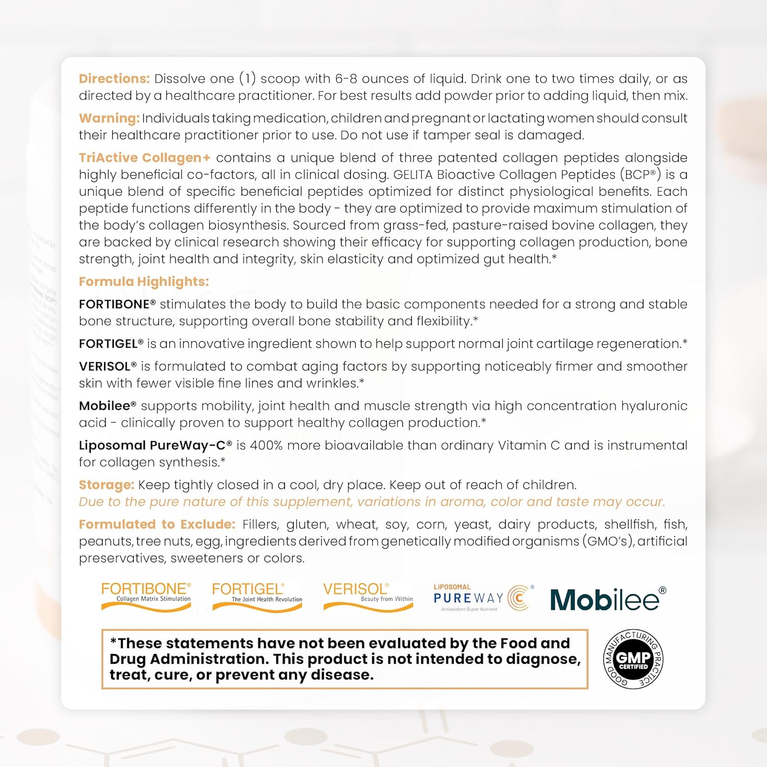 EXPERTLY FORMULATED: Our multi Collagen powder is formulated with patented Collagen peptides that have been clinically studied to support healthy bone density, joint cartilage function, strong nails, beautiful hair, and smooth skin. Its Mobilee Hyaluronic Acid matrix supports maximum mobility, and PureWay lipsomal Vitamin C is added to support Collagen synthesis. There are no fillers, wheat, gluten, GMOs, artificial colors, artificial sweeteners, or preservatives.